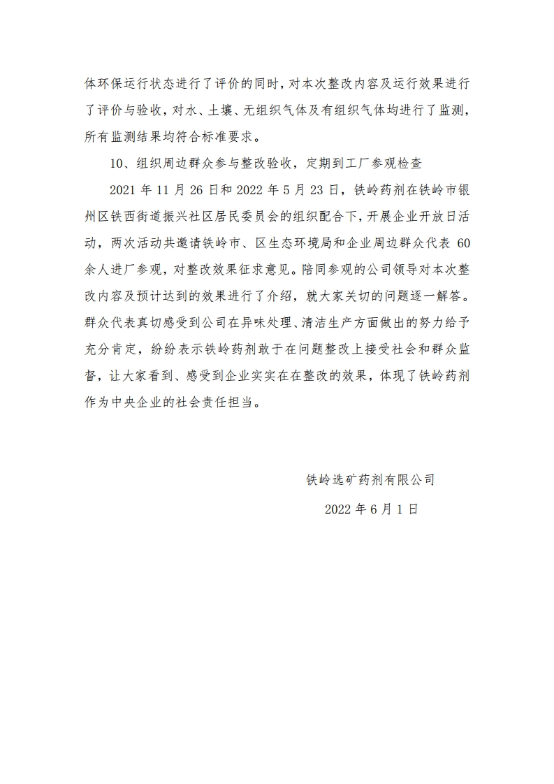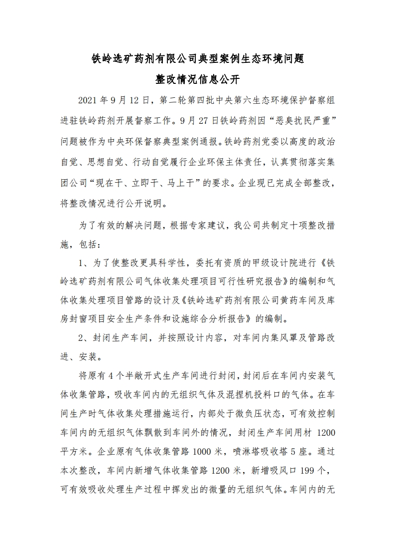鐵嶺選礦藥劑有限公司典型案例生態(tài)環(huán)境問題 整改情況信息公開